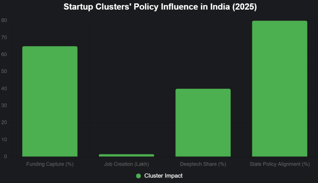 Startup clusters—geographic concentrations of ventures, talent, and support—are reshaping policy by demonstrating localized success, prompting central adaptation. Karnataka’s “Beyond Bengaluru” (Mysuru edtech, Dharwad agritech) and Maharashtra’s “Innovation City” (near Navi Mumbai Airport) exemplify, with clusters contributing 47% of $12B 2024 funding and 40% deeptech ventures, per StartupBlink. DPIIT’s 2025 report notes 30+ state policies aligning with central, with clusters like Genome Valley (Hyderabad) generating $10B biotech exports and 1,000 rural jobs. X: “Clusters decentralize policy—states innovate faster than Delhi.”